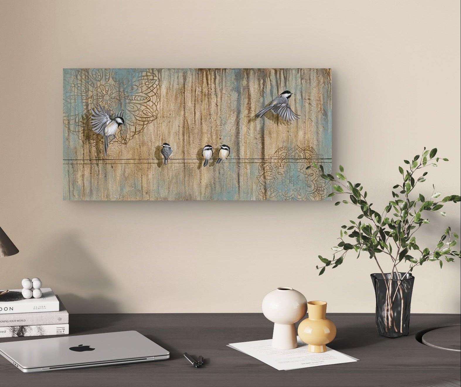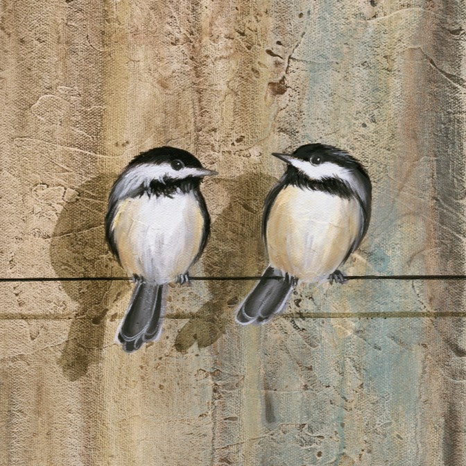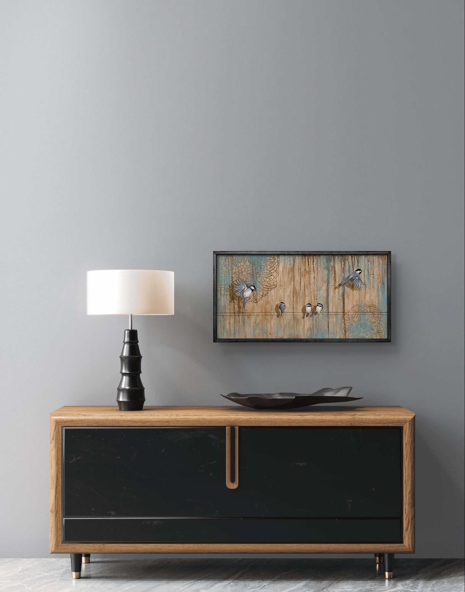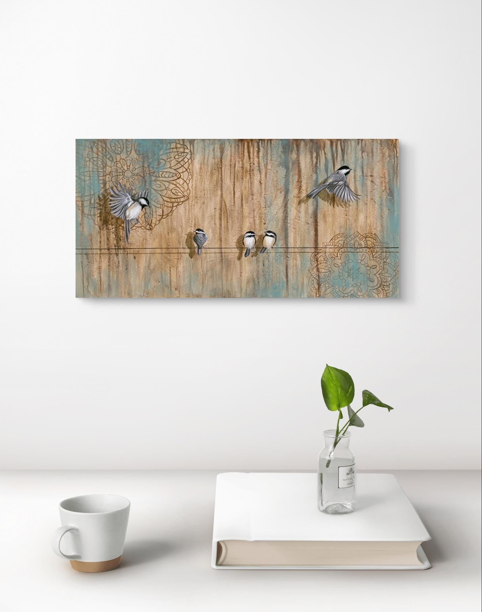 This artwork depicts five realistic chickadees on a wire with a beautiful neutral background. It features many different shades of cream and brown and has accents of muted aqua, along with the black and whites of the chickadees. It was painted with many neutrals to highlight the beautiful contrasts of the chickadees, and to blend easily with many different decors.