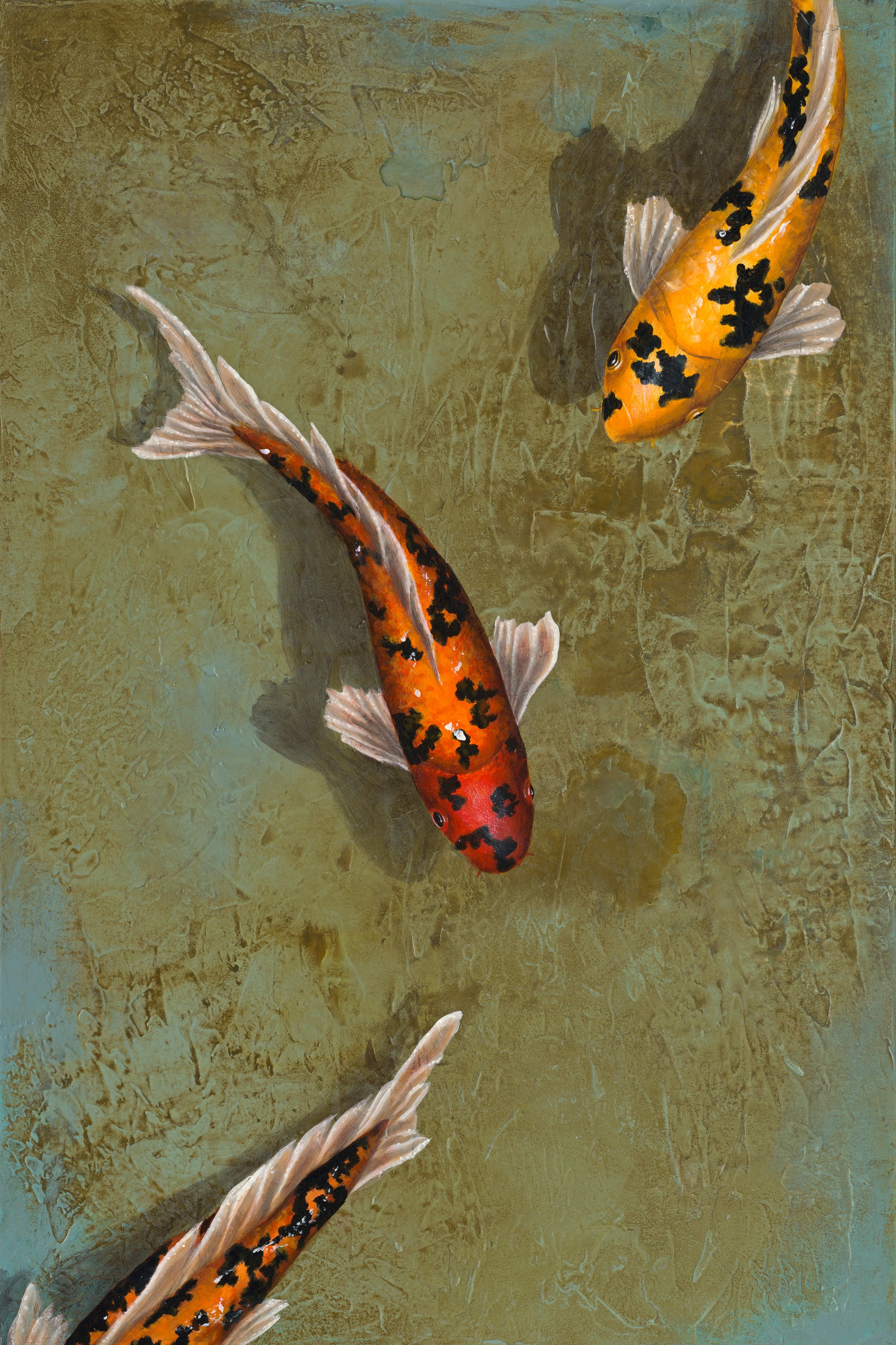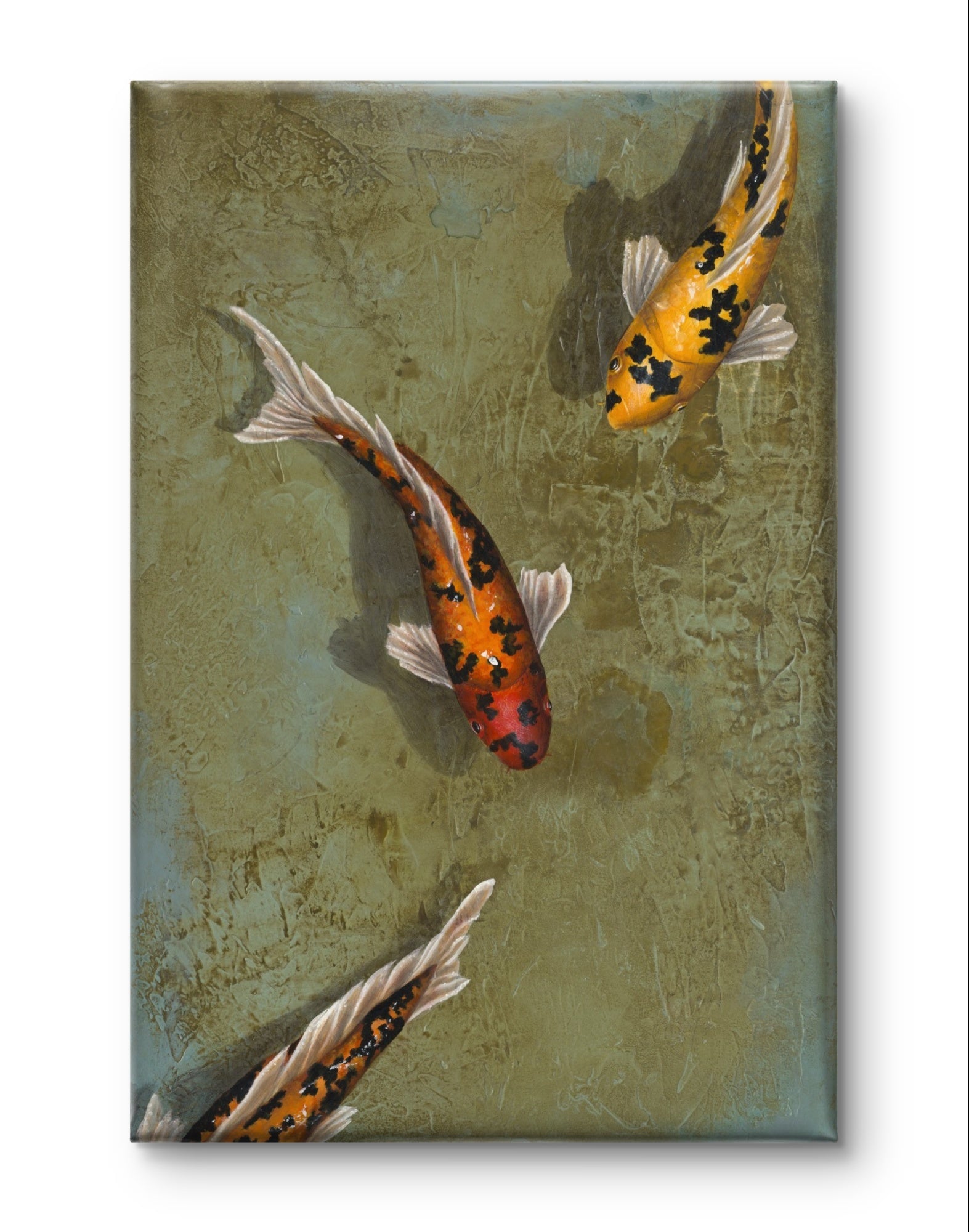 "Color Me Happy" is a high-quality reproduction of my original acrylic painting. It measures 12x18 with a .75 inch profile which is best for framing. It features three brightly colored koi carp against a textured green background with blue accents.