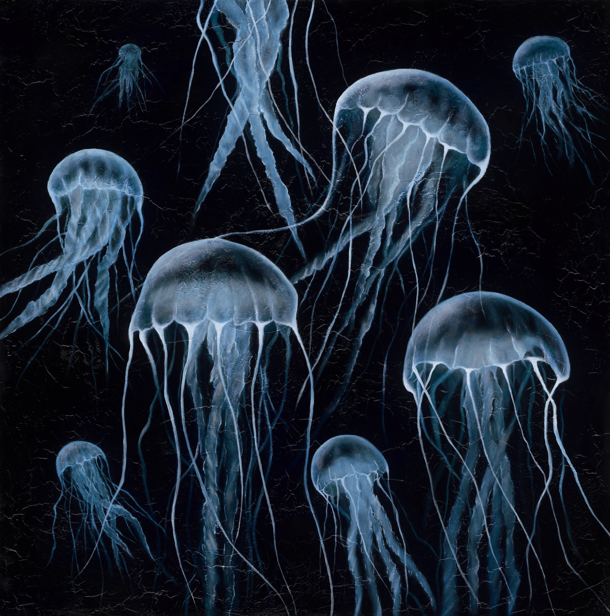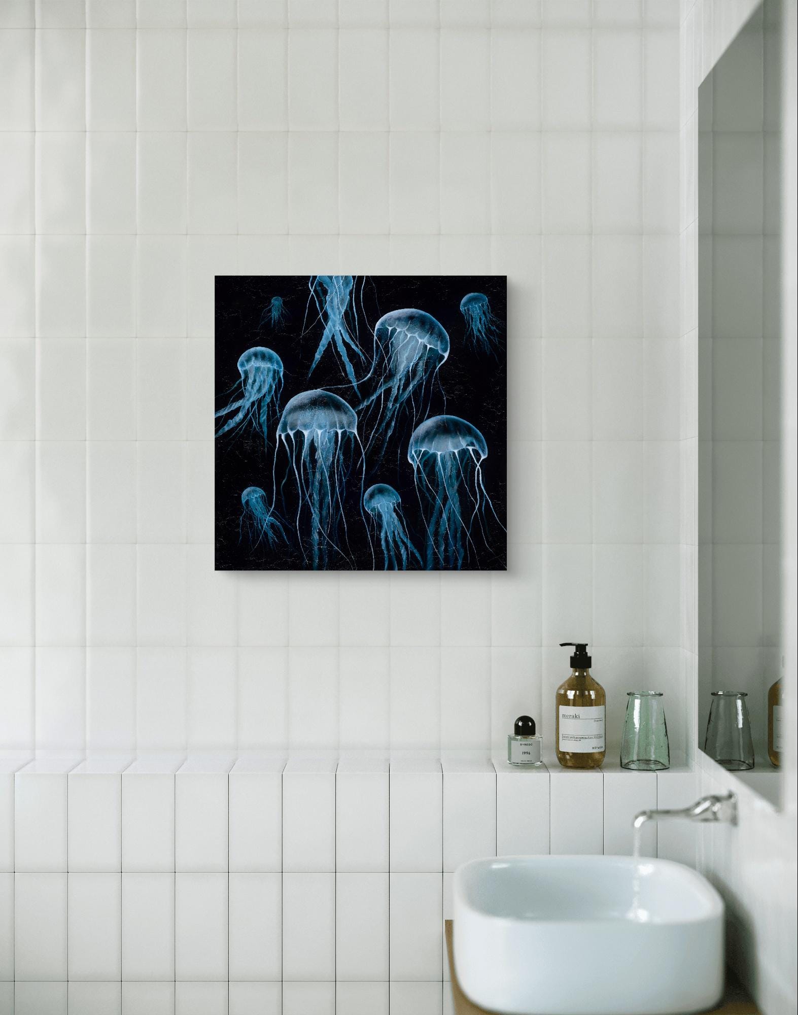 "Dance of the Jellies" is a high-quality reproduction of my original oil painting. The painting shows blue jellyfish against a black background and captures a peaceful, almost mesmerizing scene. The jellyfish’s translucent bodies glow softly, and the soft shades of blue contrast beautifully with the deep black, highlighting the gentle movement and ethereal quality of these deep-sea creatures. The overall effect is both calming and captivating. They float in deep darkness, producing their own light through bioluminescence. Don't you love it when people do the same? Unmatched beauty occurs when we can find producers of light in the darkest places.