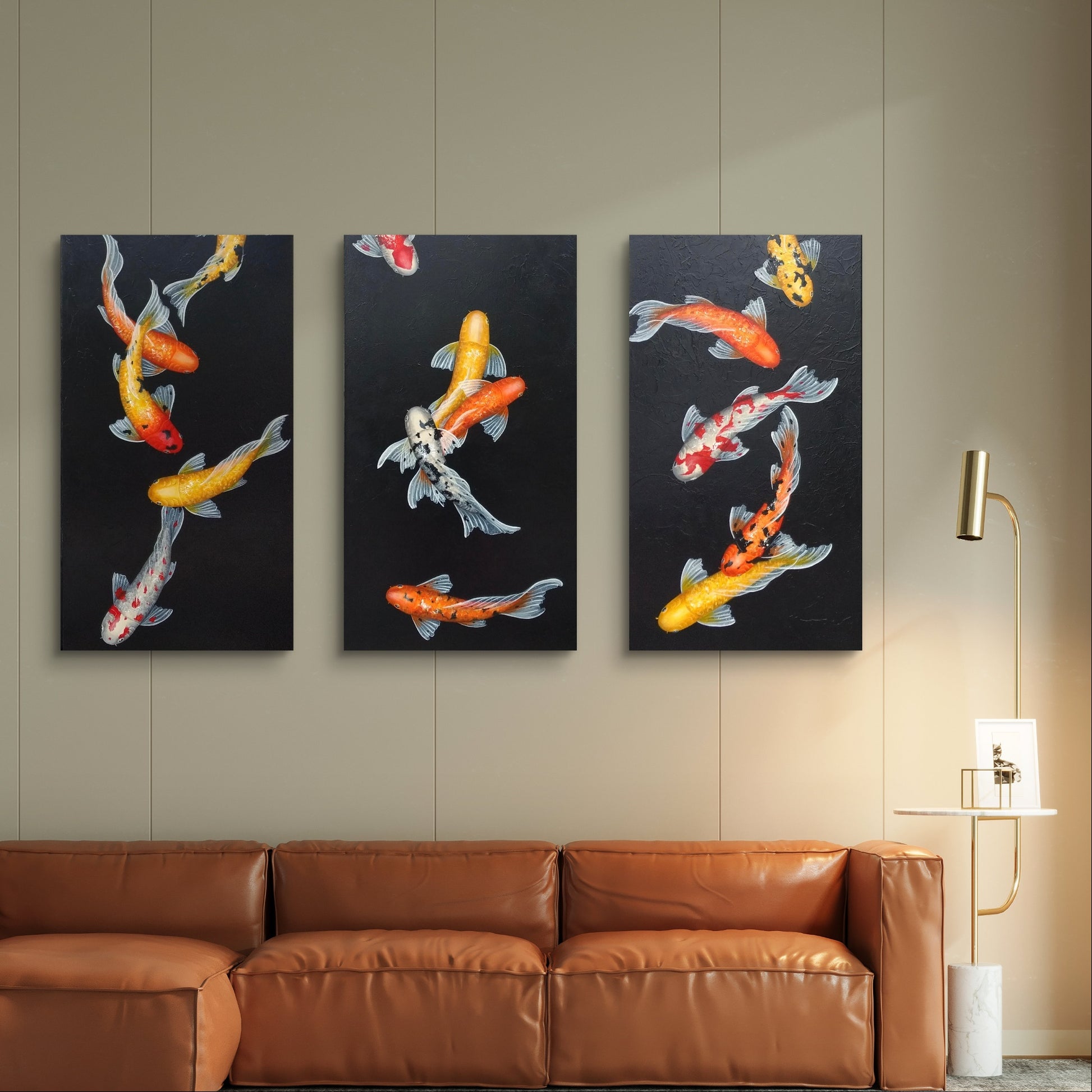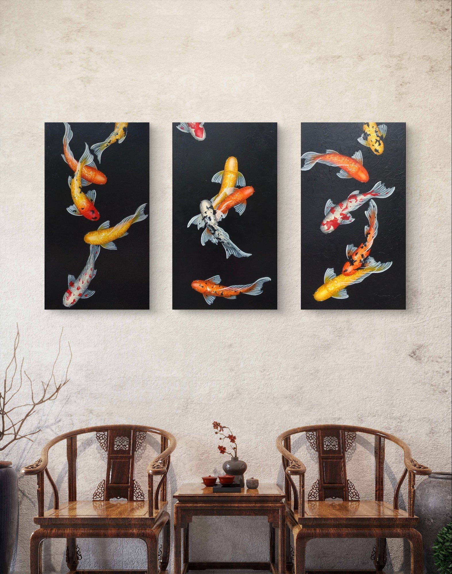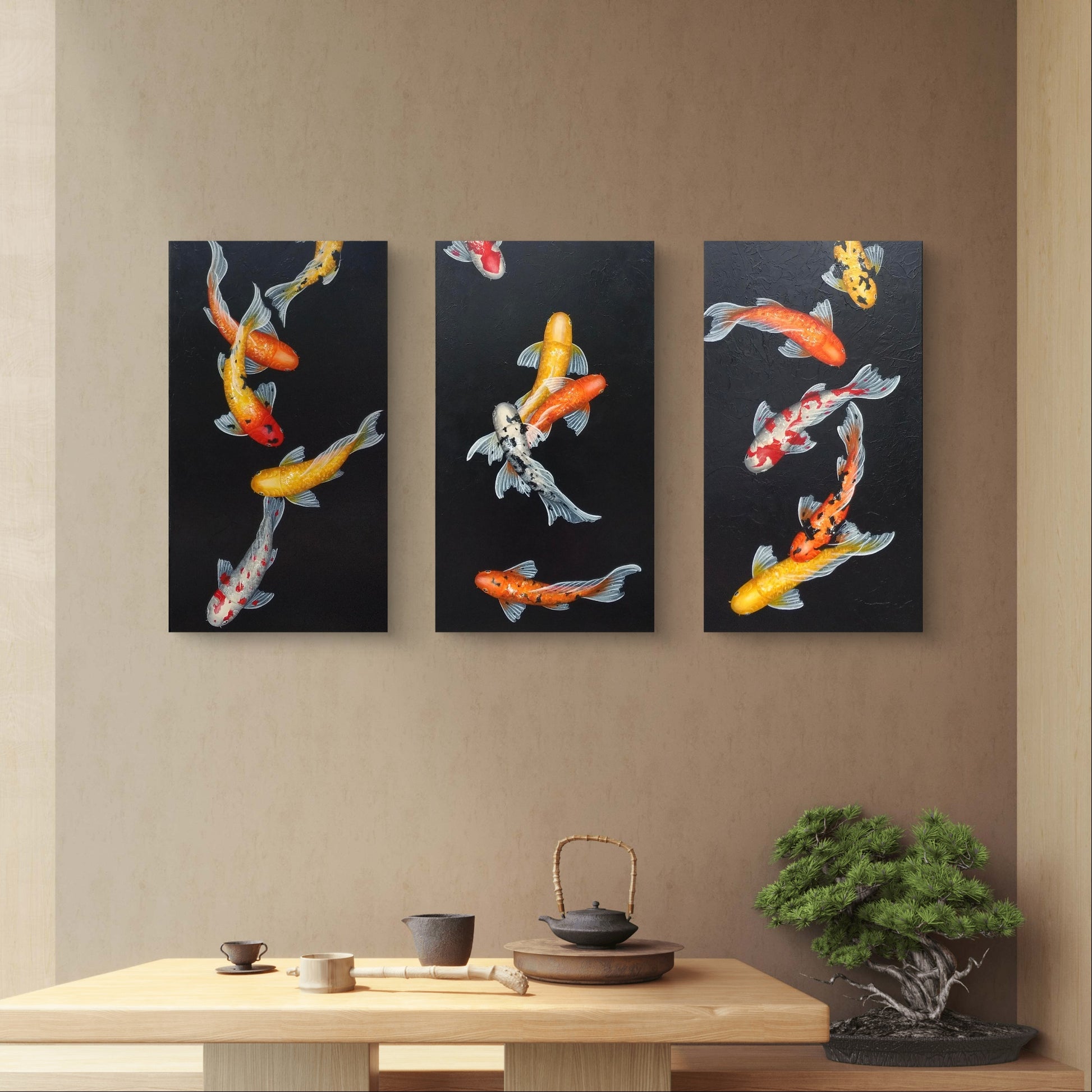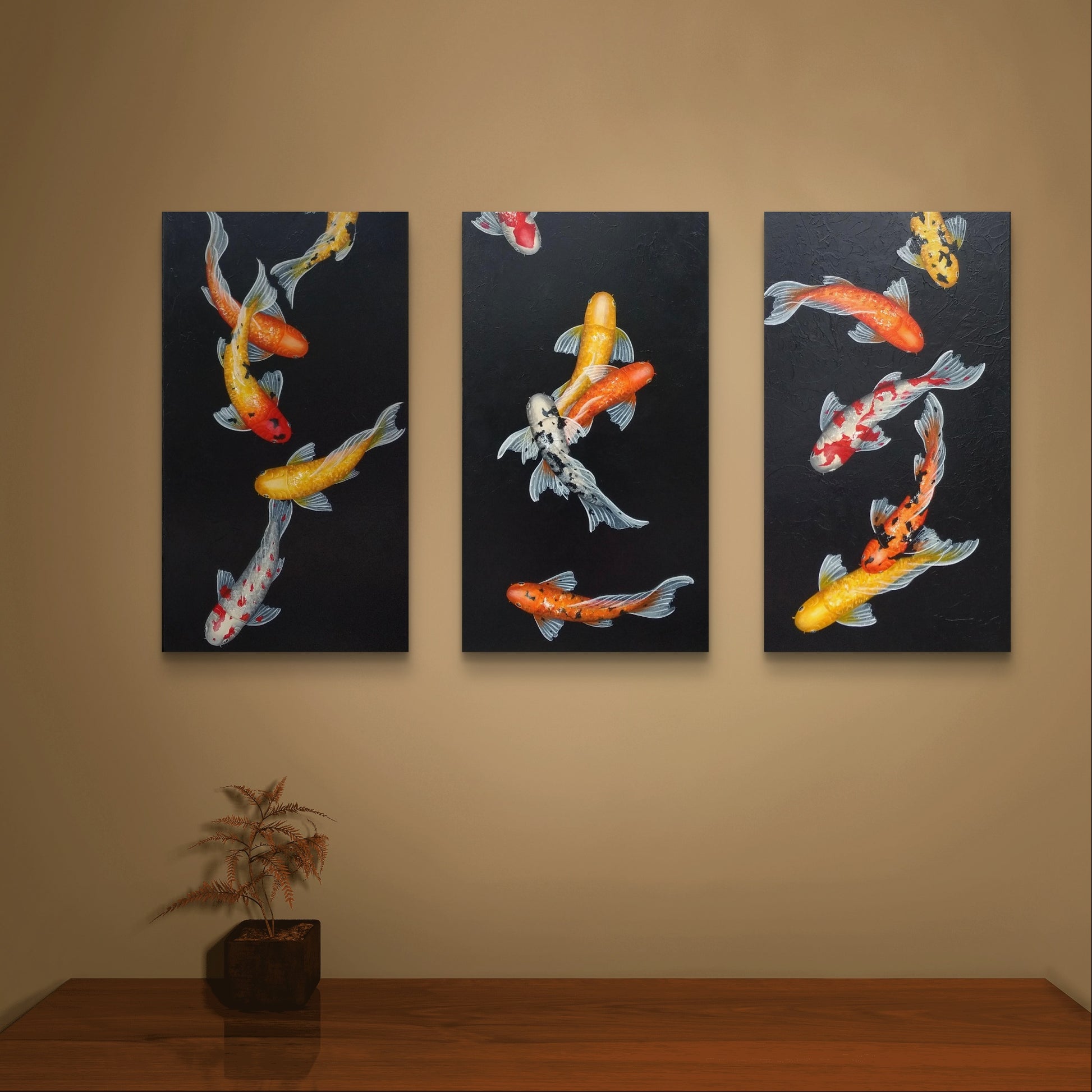 This is a custom-made, three-piece set of beautiful koi paintings, featuring an array of vividly colored koi fish gracefully swimming against a striking black background. Each koi fish is intricately detailed, showcasing bright shades of orange, yellow, and red, which pop against the dark backdrop, creating a visually captivating contrast that draws the eye.