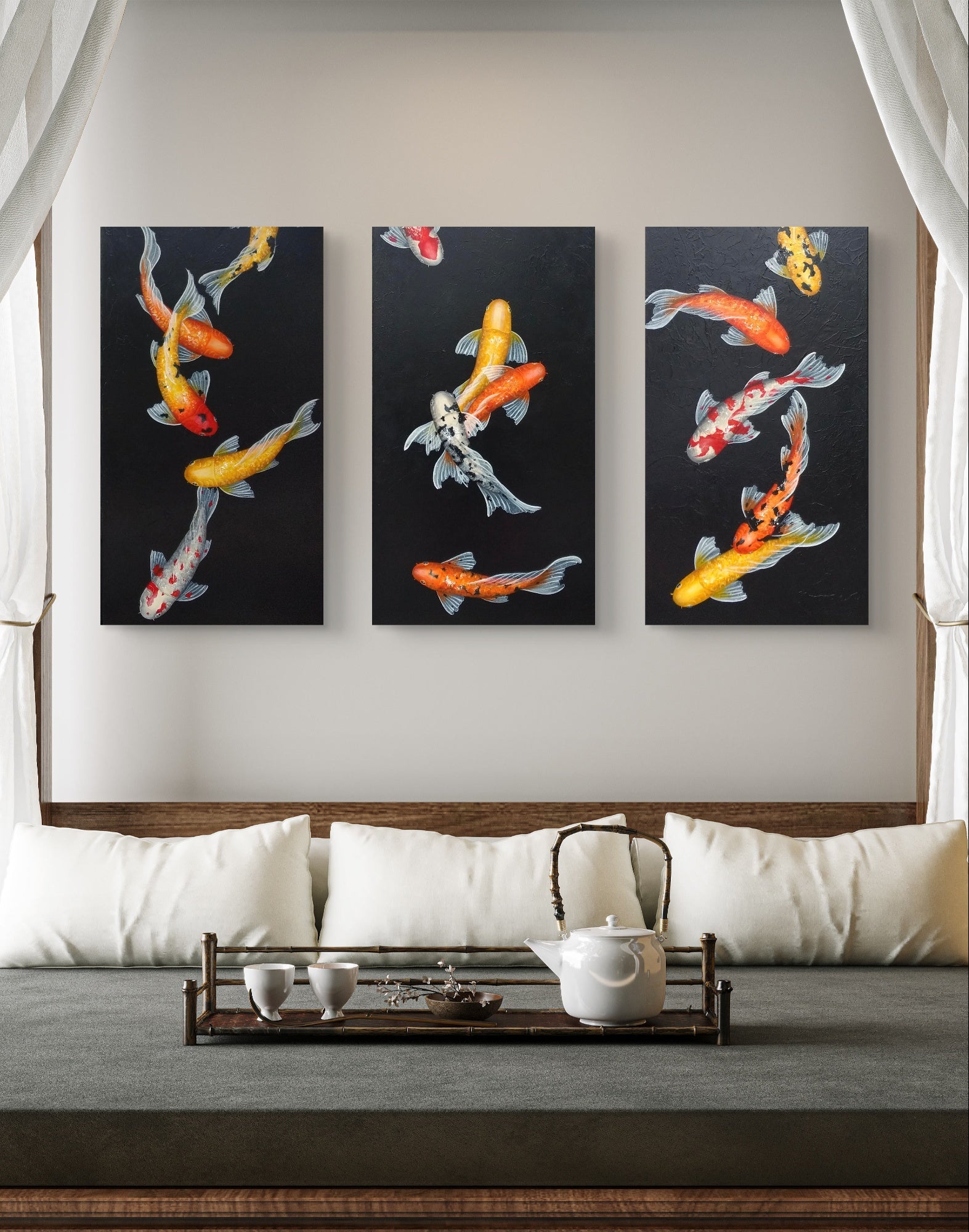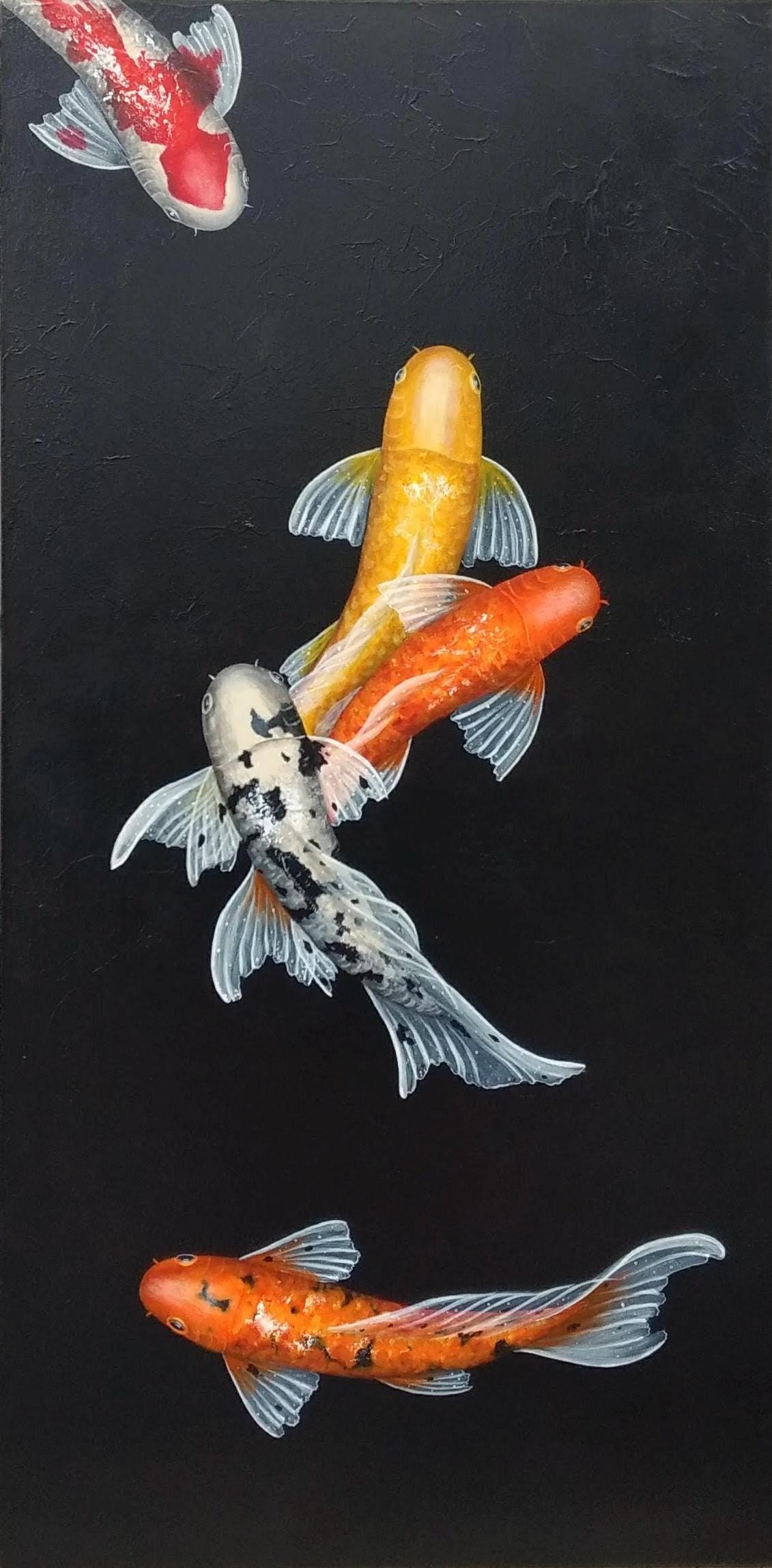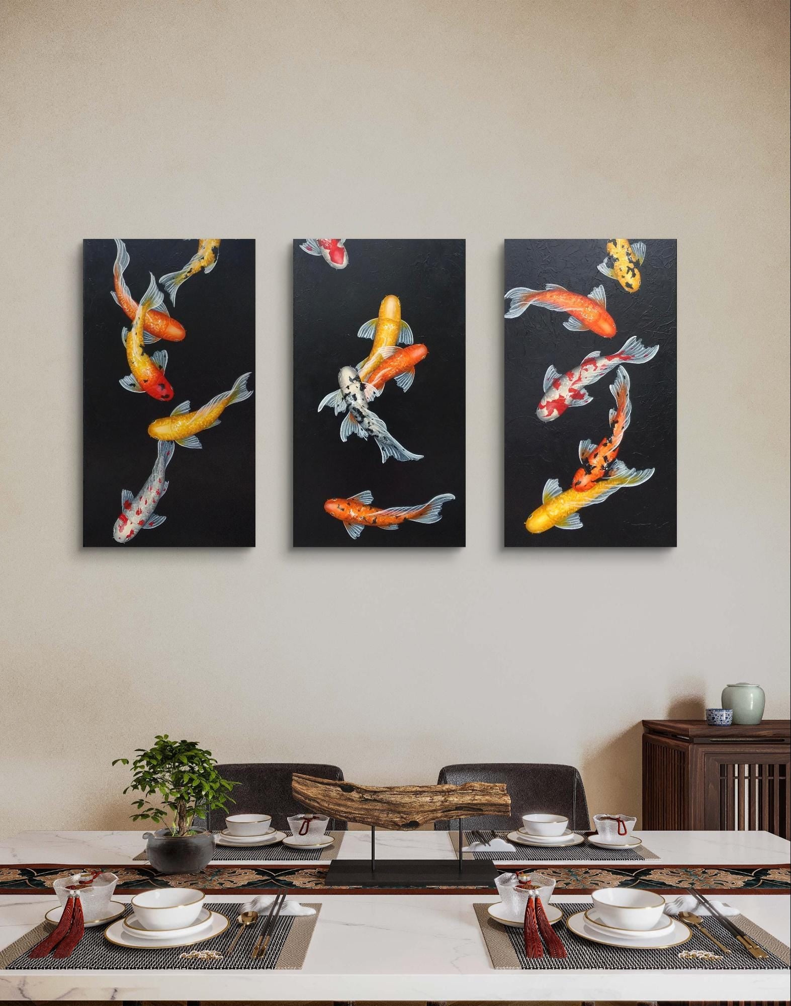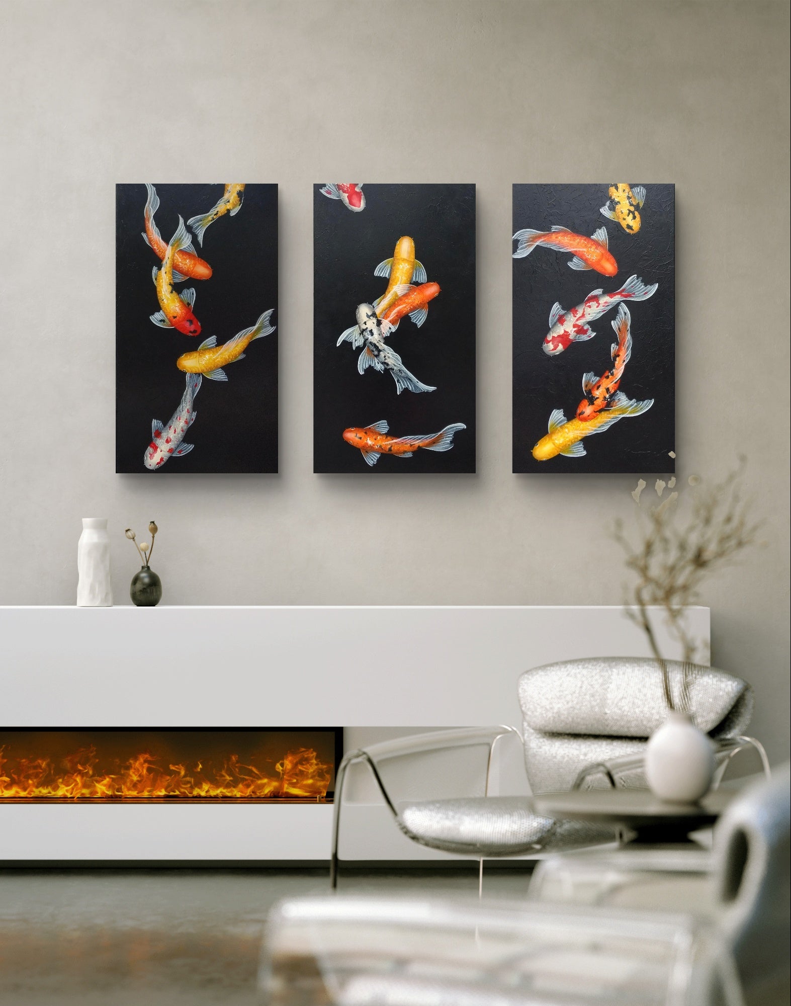 This is a custom-made, three-piece set of beautiful koi paintings, featuring an array of vividly colored koi fish gracefully swimming against a striking black background. Each koi fish is intricately detailed, showcasing bright shades of orange, yellow, and red, which pop against the dark backdrop, creating a visually captivating contrast that draws the eye.