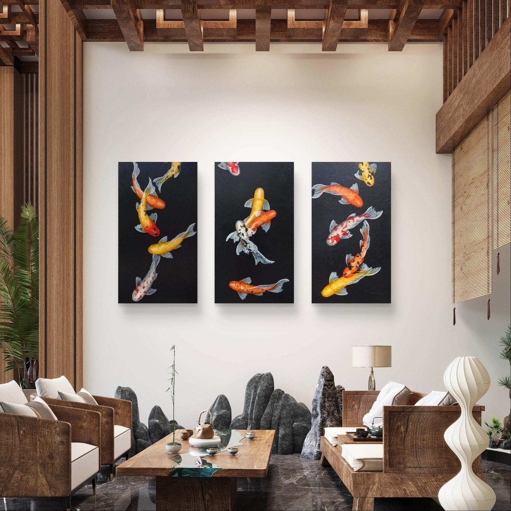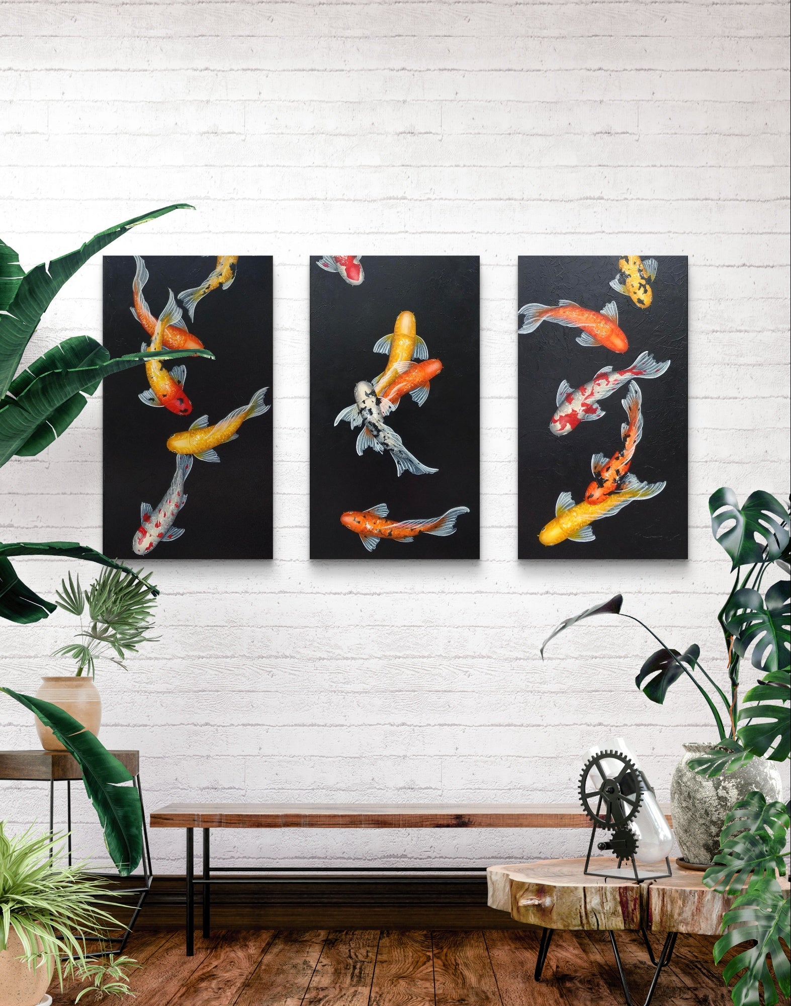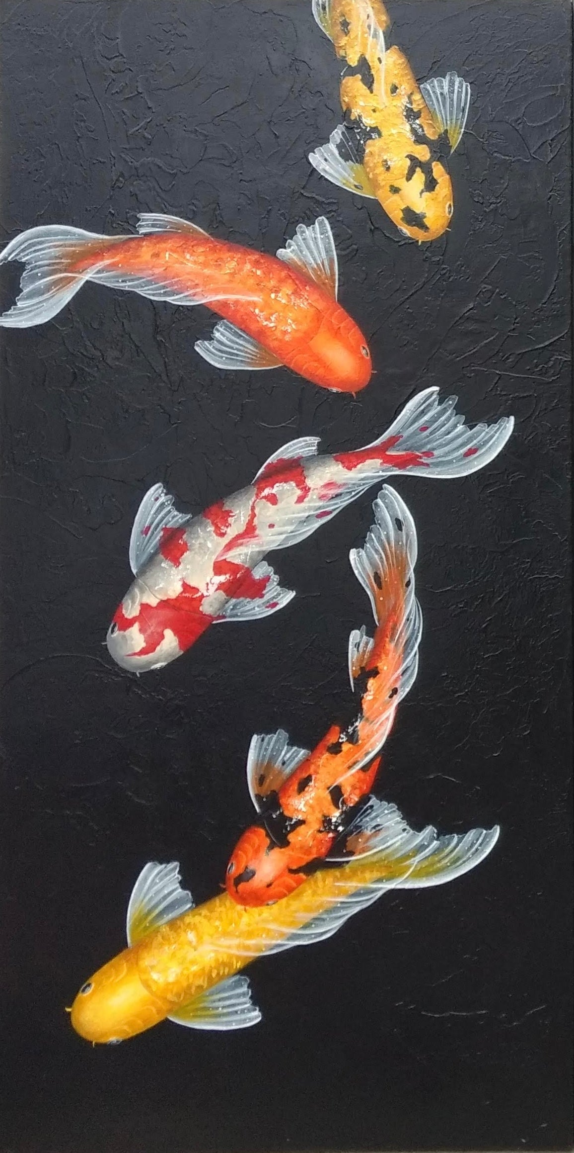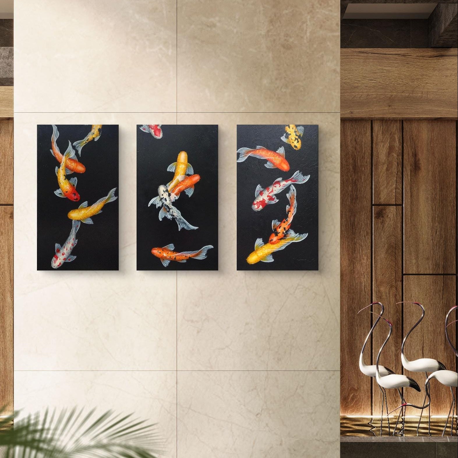 This is a custom-made, three-piece set of beautiful koi paintings, featuring an array of vividly colored koi fish gracefully swimming against a striking black background. Each koi fish is intricately detailed, showcasing bright shades of orange, yellow, and red, which pop against the dark backdrop, creating a visually captivating contrast that draws the eye.