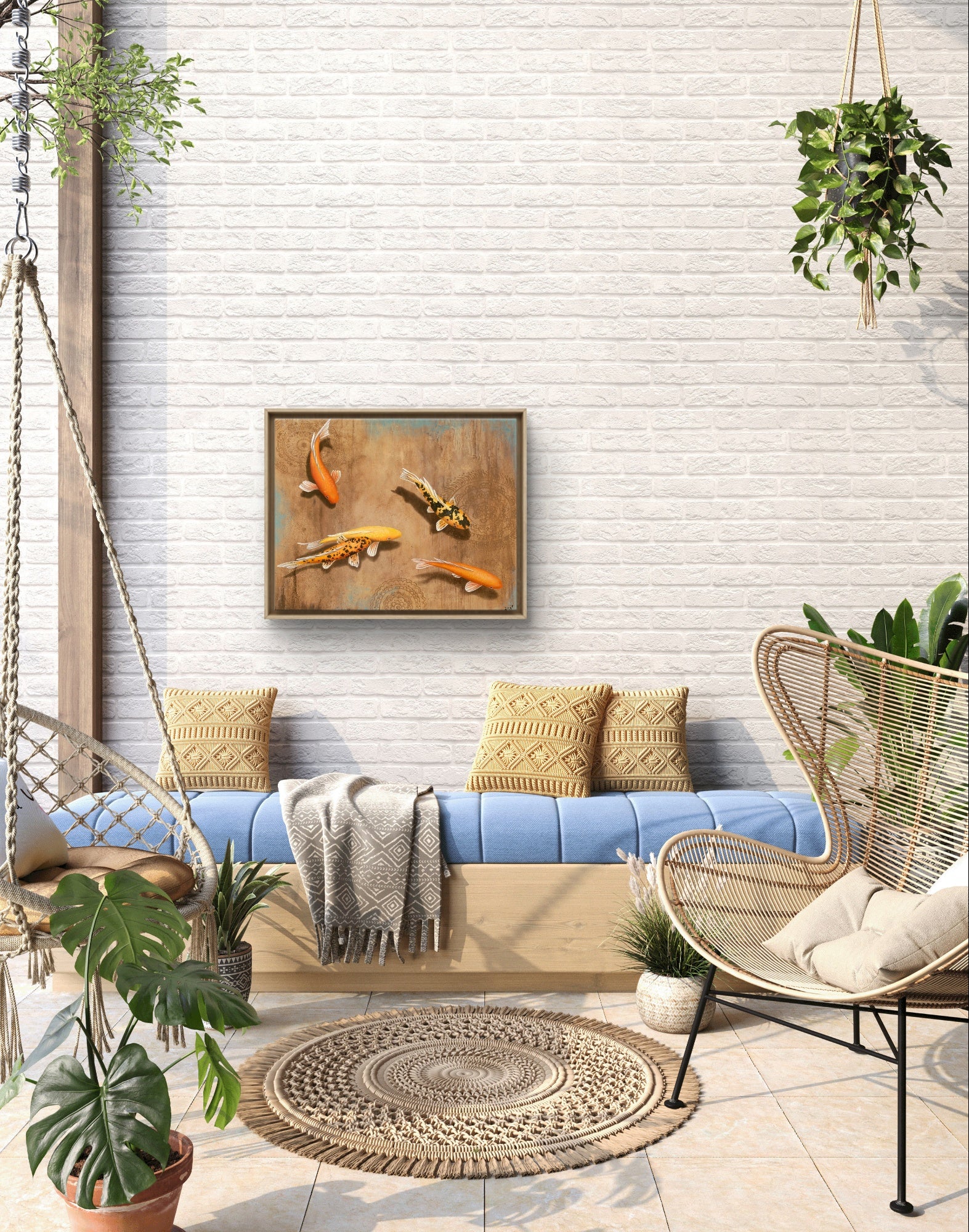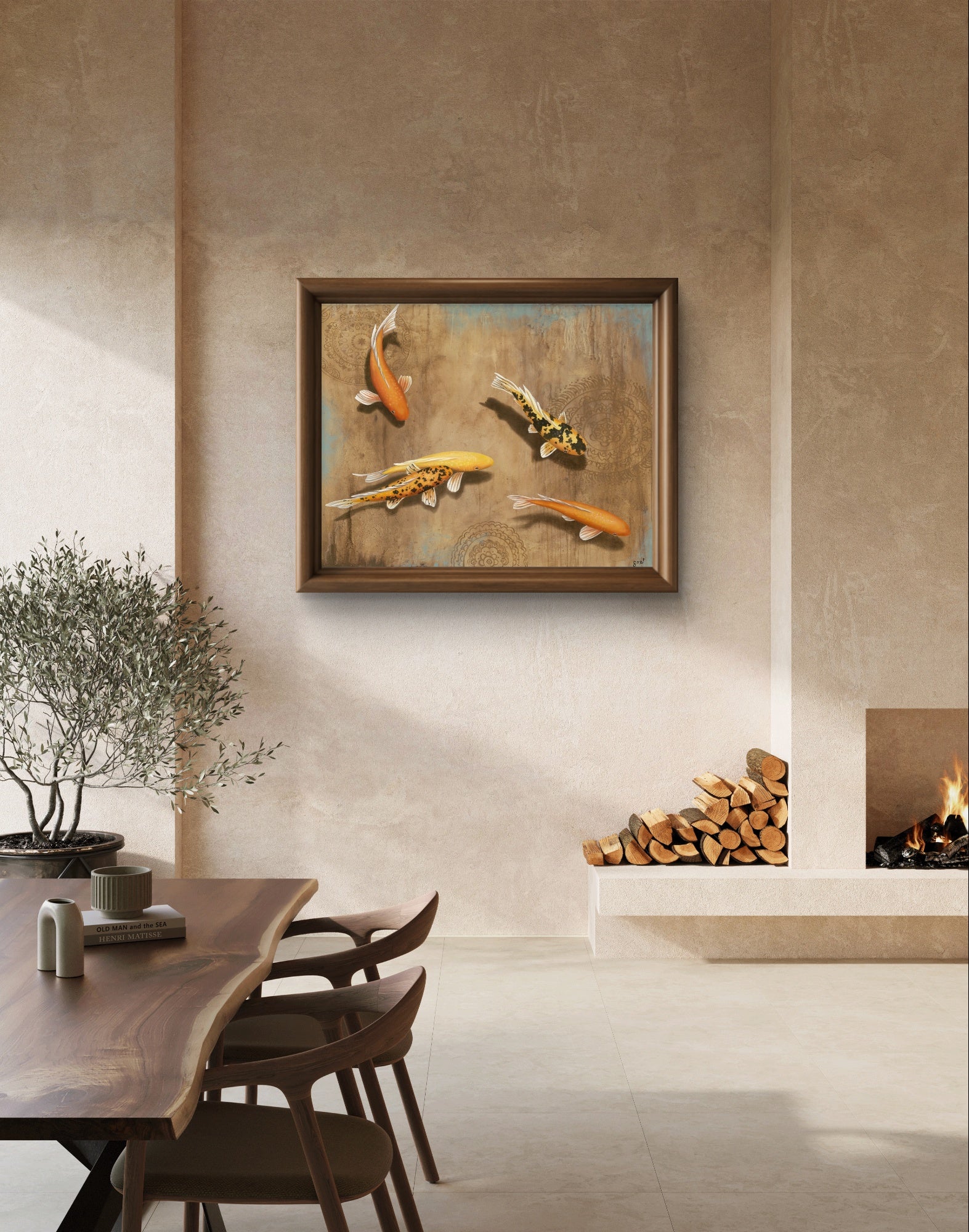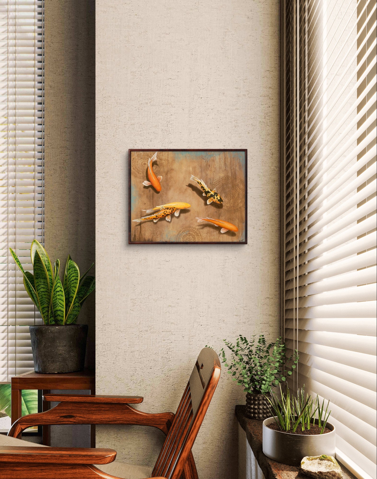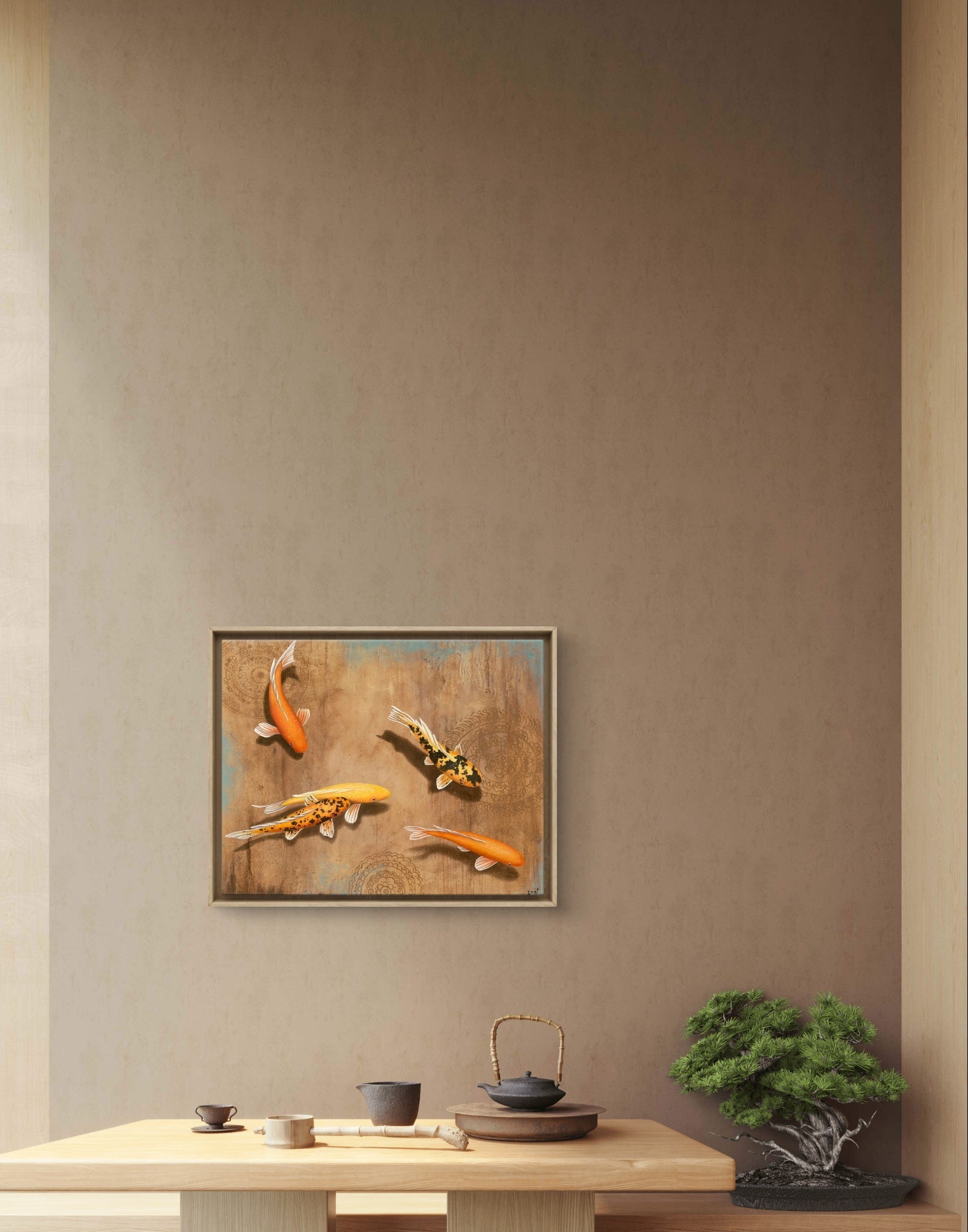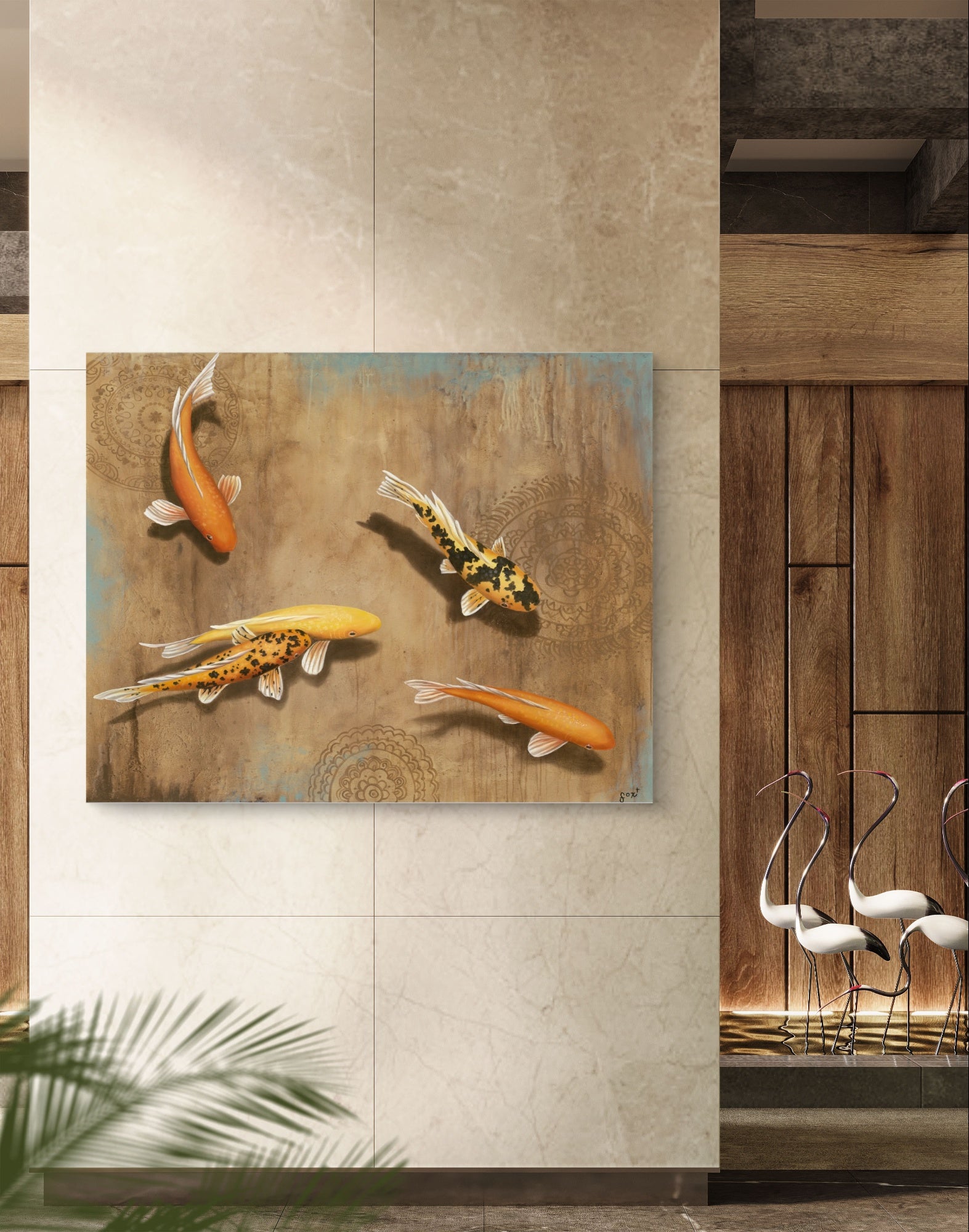 Koi art can fit various styles of interior design, from traditional to modern, making it a versatile choice for both home and office environments.