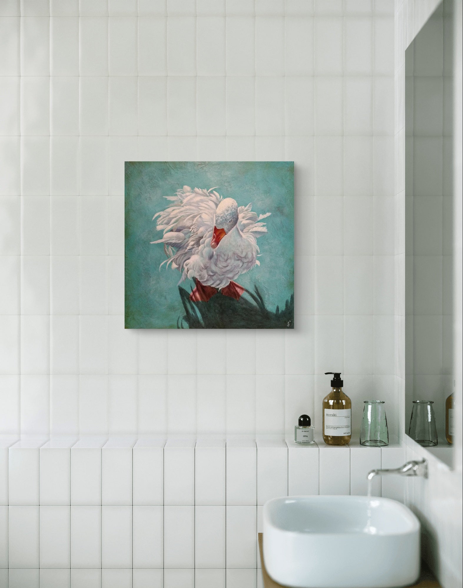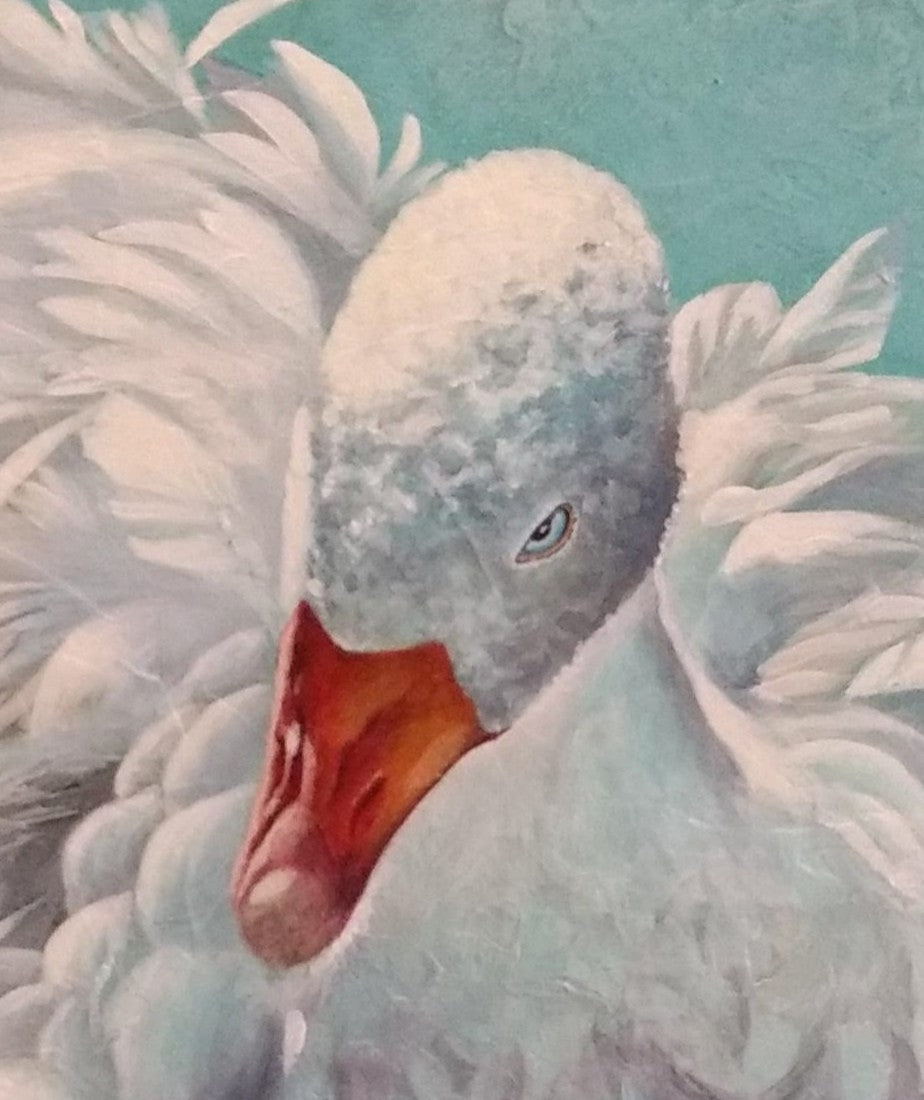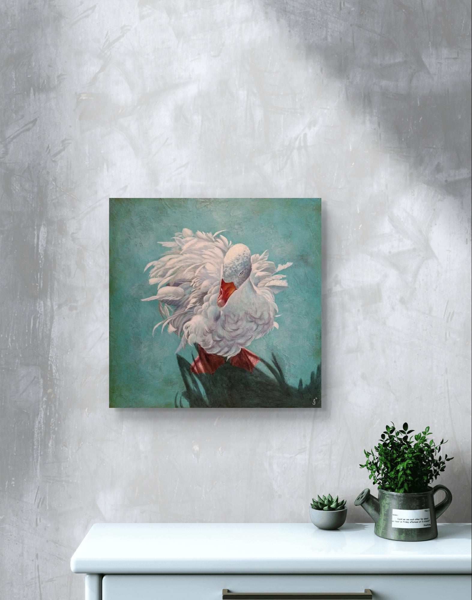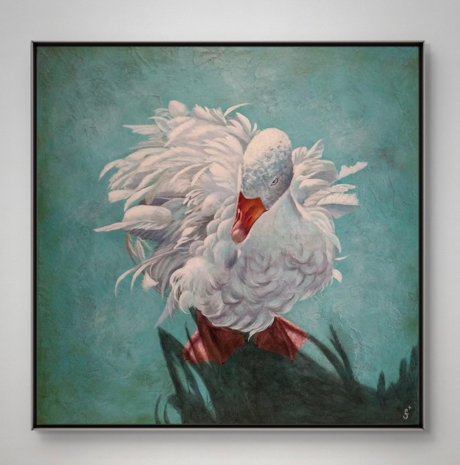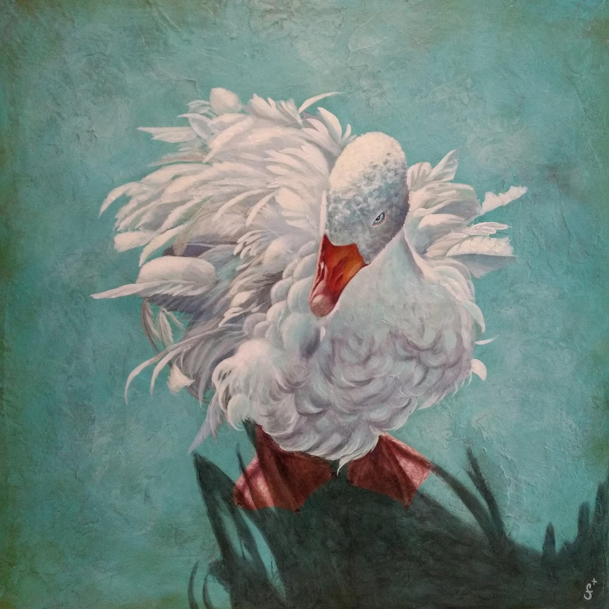 "Scraggly" is an exceptional reproduction of my original acrylic painting. It shows a fluffy, messy, wildly feathered goose against an aqua colored background.