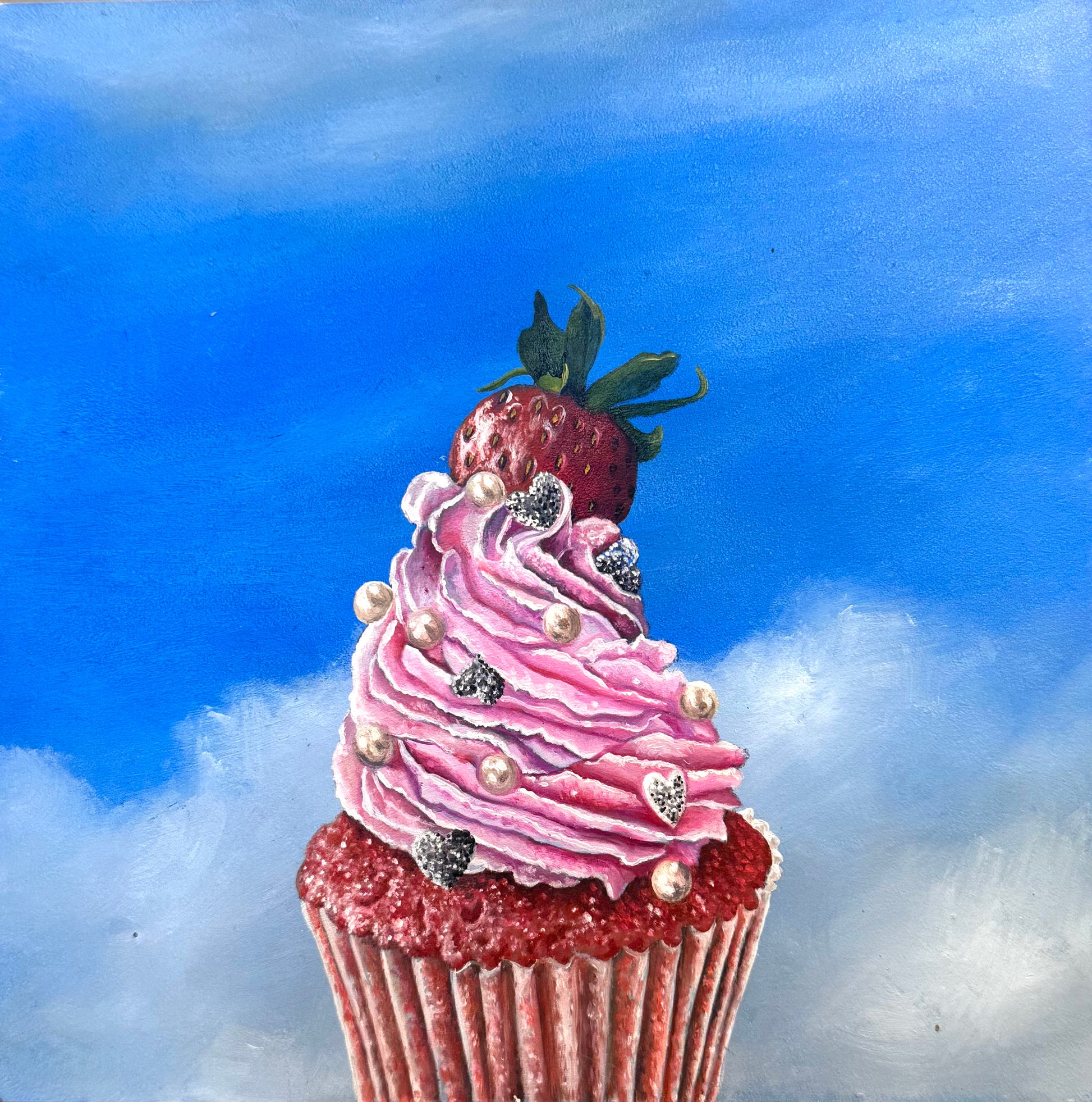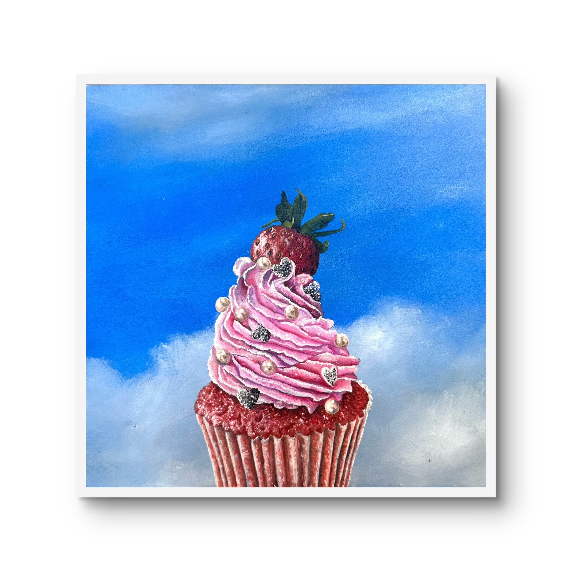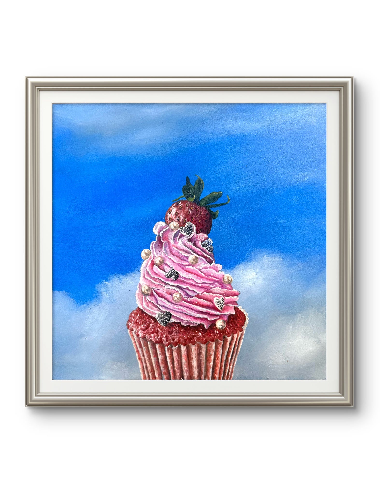 Add a touch of whimsy and sweetness to your home with this charming oil painting, "Strawberry Sweetness". Featuring a cute strawberry cupcake topped with tall, pink frosting, pearls and sparkly hearts, and a fresh strawberry on top. This is set against a cheerful sky background, bringing a bit of joy and playfulness.